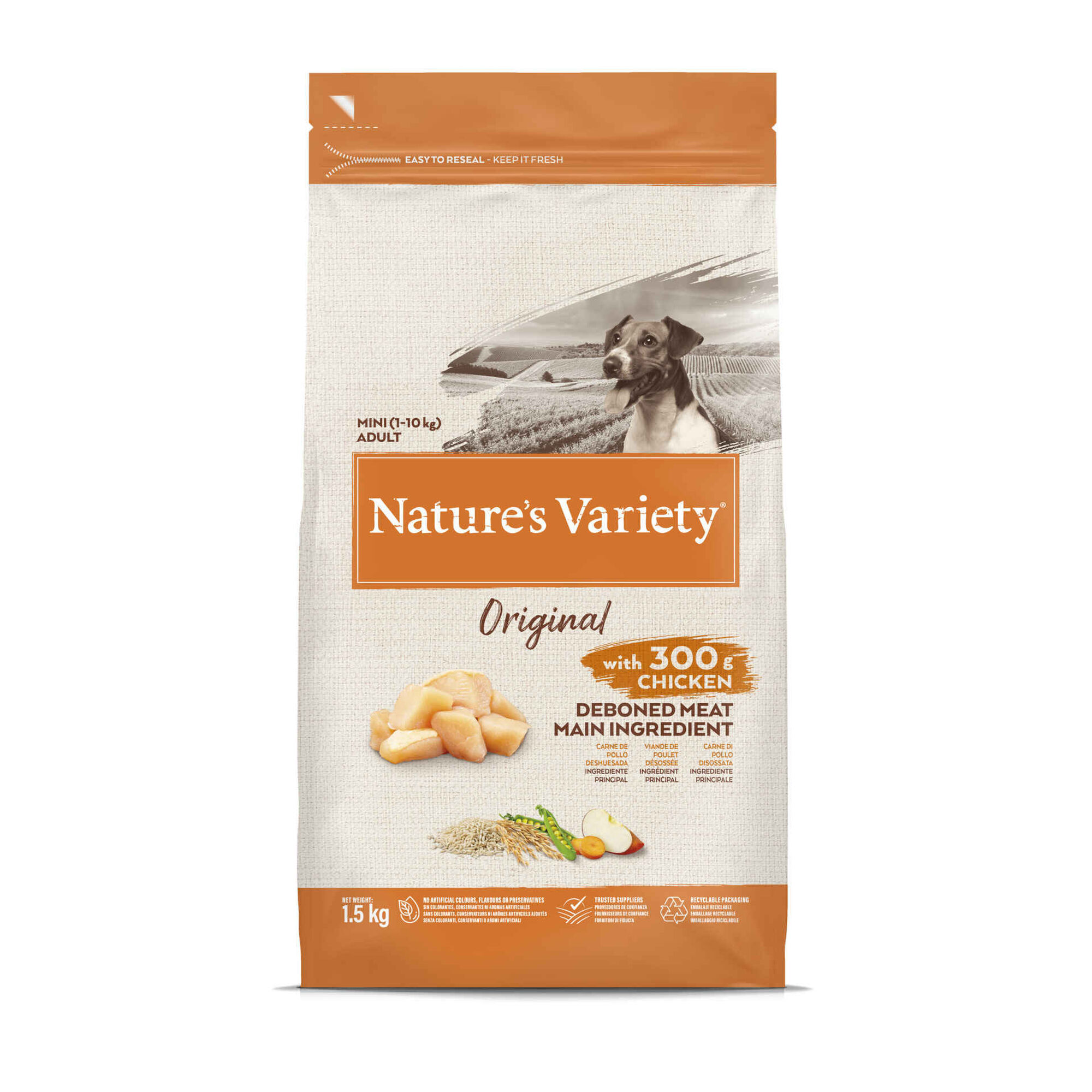 A ração para cães Nature’s Variety Original Mini Frango é um alimento baseado na combinação de ingredientes naturais que tem como produto principal a carne. Com um 36% de carne de frango e 8% de peru, esta ração proporciona ao seu cão uma quantidade ótima de proteínas e calorias para que possa aproveitar da melhor atividade física. A carne está combinada com uma seleção de cereais integrais, frutas e verduras que irão melhorar o estado de saúde do seu cão.