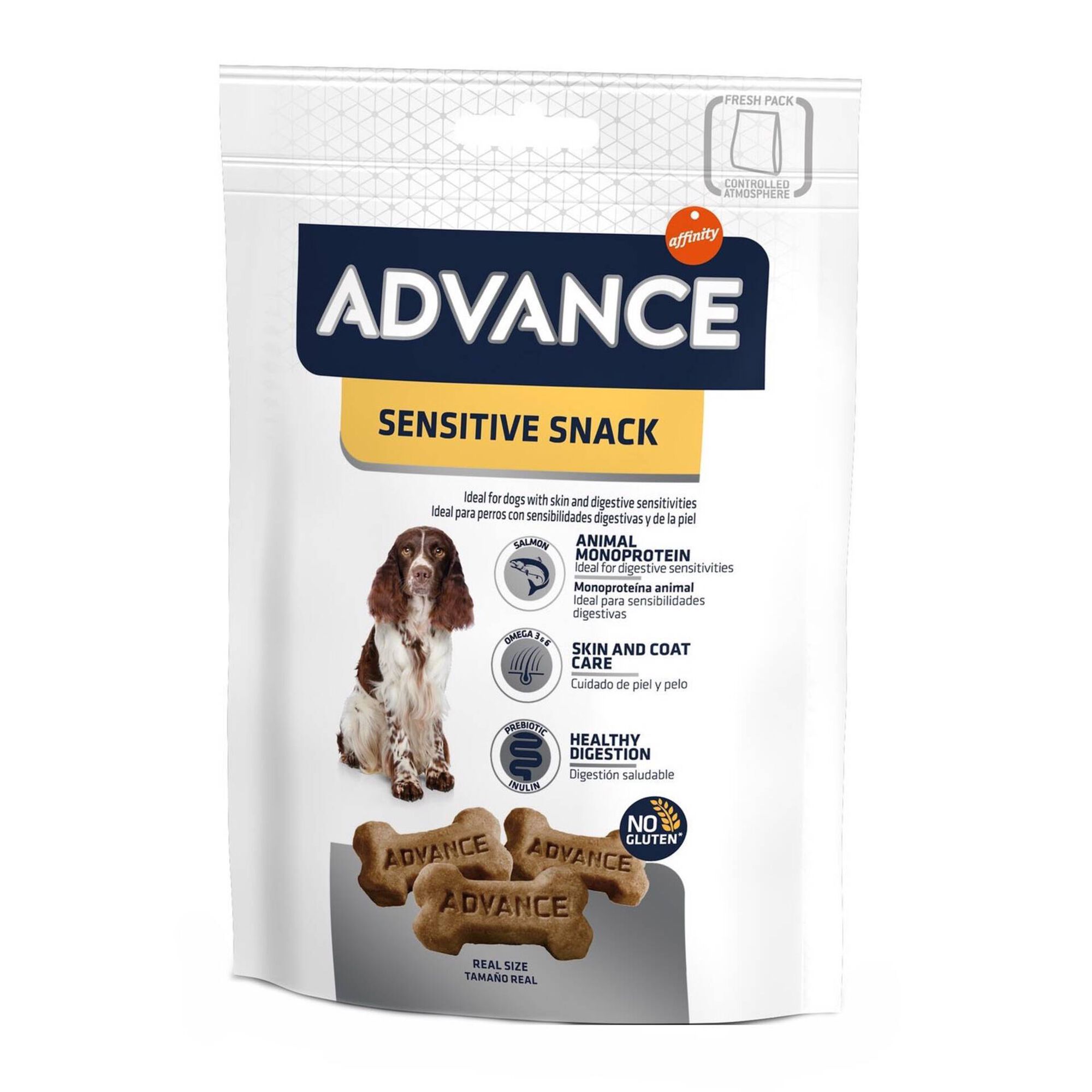 Advance Sensitive Snack para cães sensíveis é um delicioso snack de salmão que fornece ácidos gordos ómega 3 e ómega 6 para uma pele e pêlo saudáveis. É uma guloseima ideal para recompensar os cães que têm o estômago ou a pele sensíveis. Sensitive Snack é uma bolacha com formato de osso e com uma textura tenra que o seu animal de estimação vai adorar. Utiliza uma única proteína animal, proveniente do salmão, e algas e prebióticos para melhorar a flora intestinal. Além disso, não contém glúten.